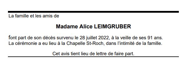 Madame Alice LEIMGRUBER 17 aoû. 1931 - 28 juil. 2022 Avis mortuaire PFG Télecharger PDF Partager sur: Galerie PreviousNext PreviousNext