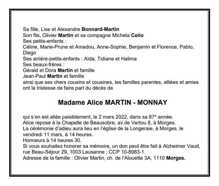 Madame Alice MARTIN - MONNAY