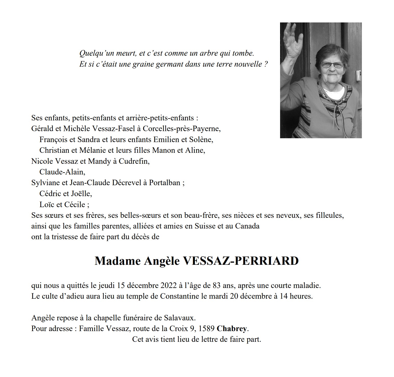 Madame Angèle VESSAZ-PERRIARD 13 fév. 1939 - 15 déc. 2022 Avis mortuaire PFG Télecharger PDF Partager sur: Galerie PreviousNext PreviousNext
