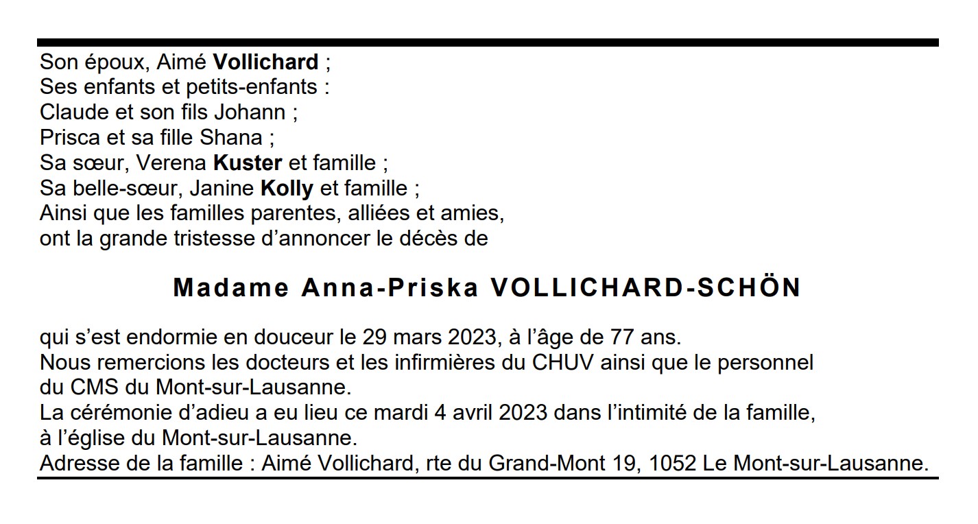 Madame Anna-Priska VOLLICHARD-SCHÖN 07 mar. 1946 - 29 mar. 2023 Avis mortuaire PFG Télecharger PDF Partager sur: Galerie PreviousNext PreviousNext