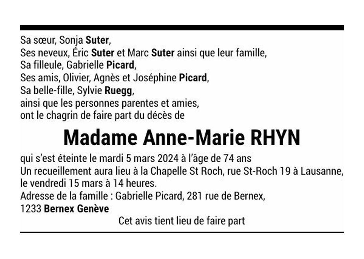 Madame Anne-Marie RHYN 08 juil. 1949 - 05 mar. 2024 Avis mortuaire PFG Télecharger PDF Partager sur: Galerie PreviousNext PreviousNext