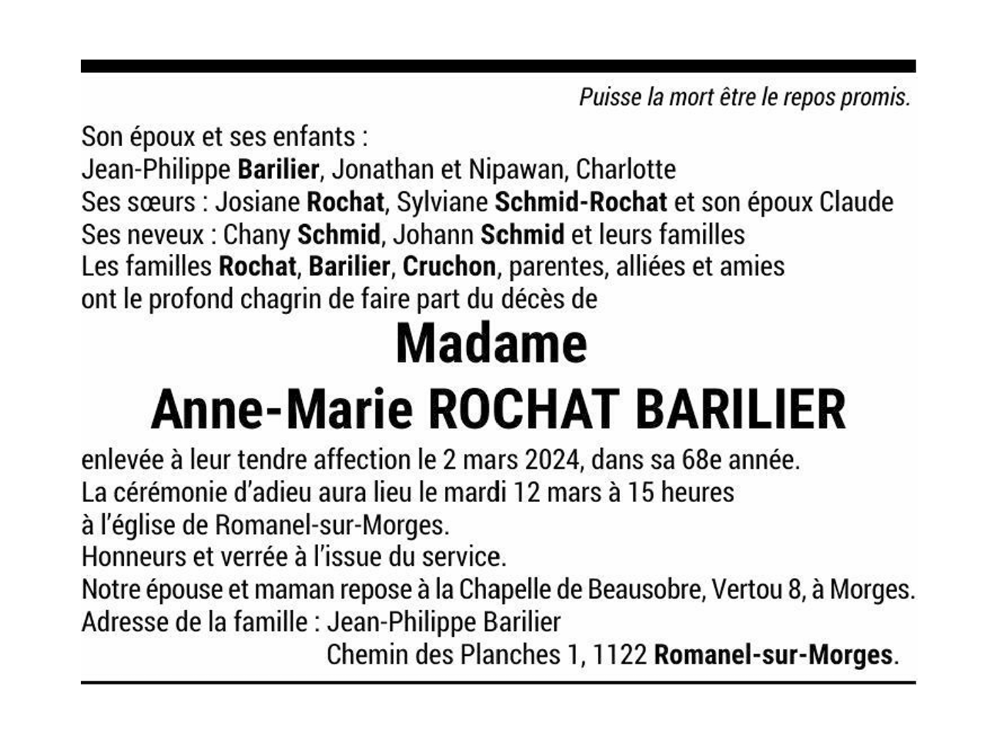 Madame Anne-Marie ROCHAT BARILIER 22 nov. 1956 - 02 mar. 2024 Avis mortuaire PFG Télecharger PDF Partager sur: Galerie PreviousNext PreviousNext