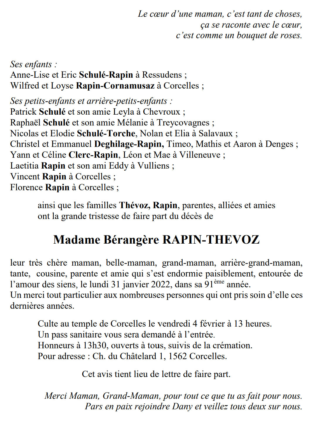 Madame Bérangère RAPIN-THEVOZ