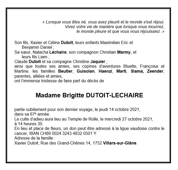 Madame Brigitte DUTOIT-LECHAIRE 06 fév. 1955 - 14 oct. 2021 Avis mortuaire PFG Télecharger PDF Partager sur: Galerie PreviousNext PreviousNext