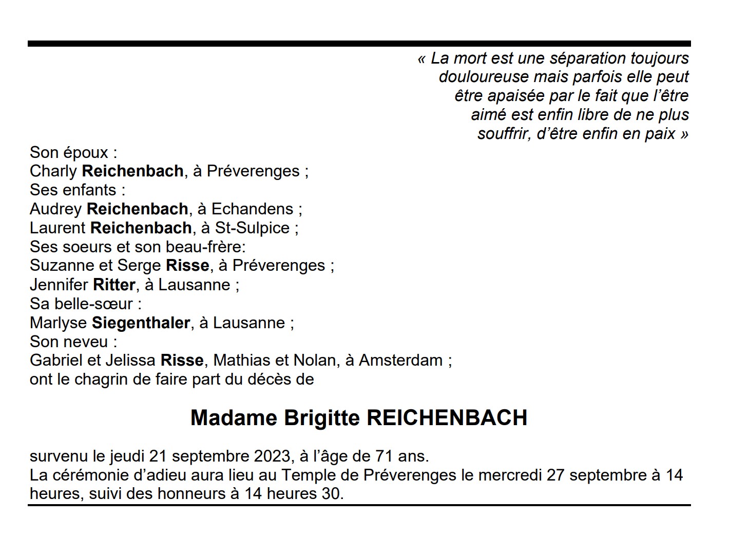 Madame Brigitte REICHENBACH 03 jan. 1952 - 21 sep. 2023 Avis mortuaire PFG Télecharger PDF Partager sur: Galerie PreviousNext PreviousNext
