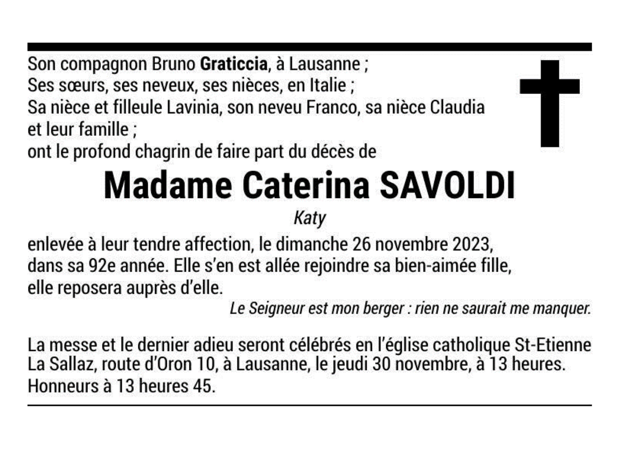 Madame Caterina SAVOLDI Katy 29 mai. 1932 - 26 nov. 2023 Avis mortuaire PFG Télecharger PDF Partager sur: Galerie PreviousNext PreviousNext