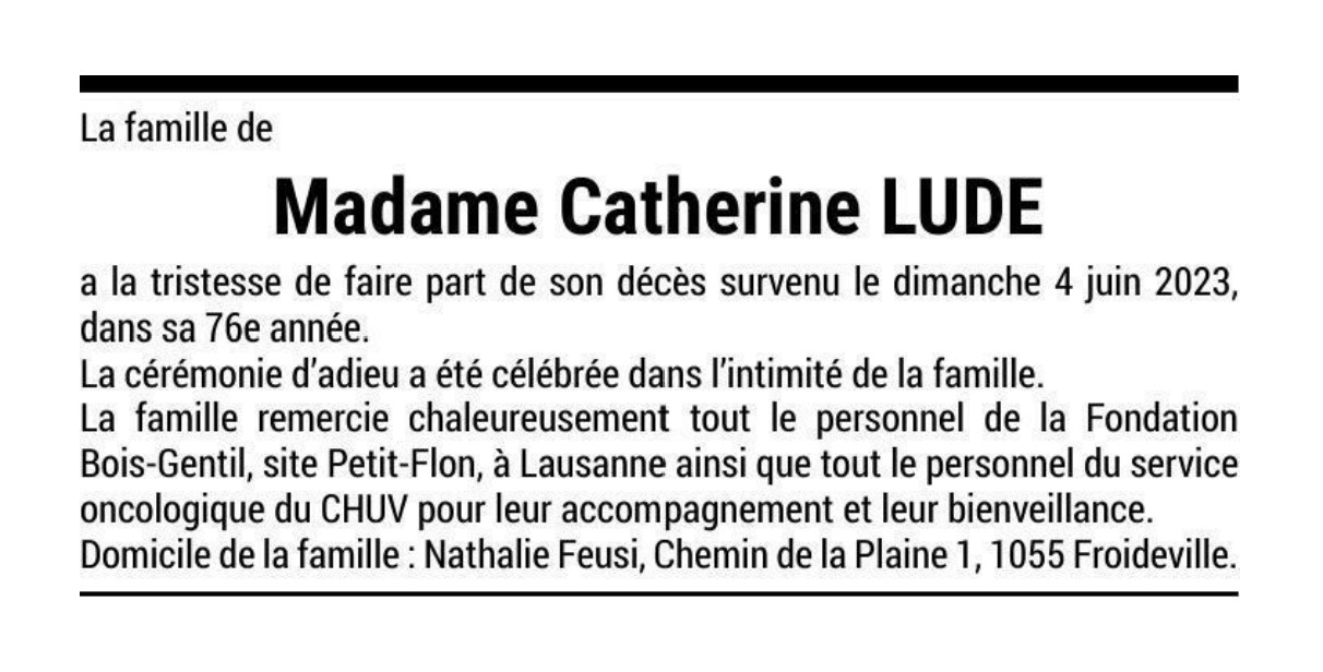 Madame Catherine LUDE 22 juil. 1947 - 04 juin. 2023 Avis mortuaire PFG Télecharger PDF Partager sur: Galerie PreviousNext PreviousNext