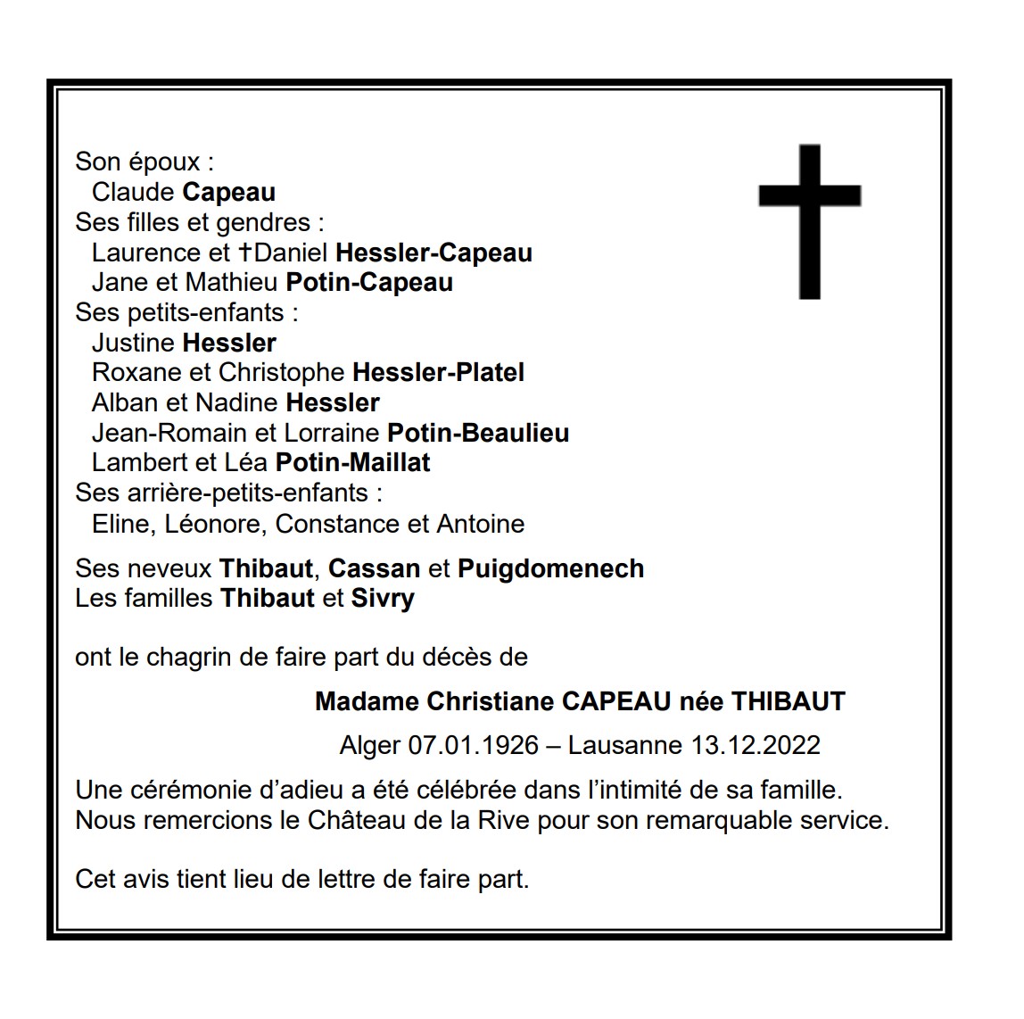 Madame Christiane CAPEAU 07 jan. 1926 - 13 déc. 2022 Avis mortuaire PFG Télecharger PDF Partager sur: Galerie PreviousNext PreviousNext