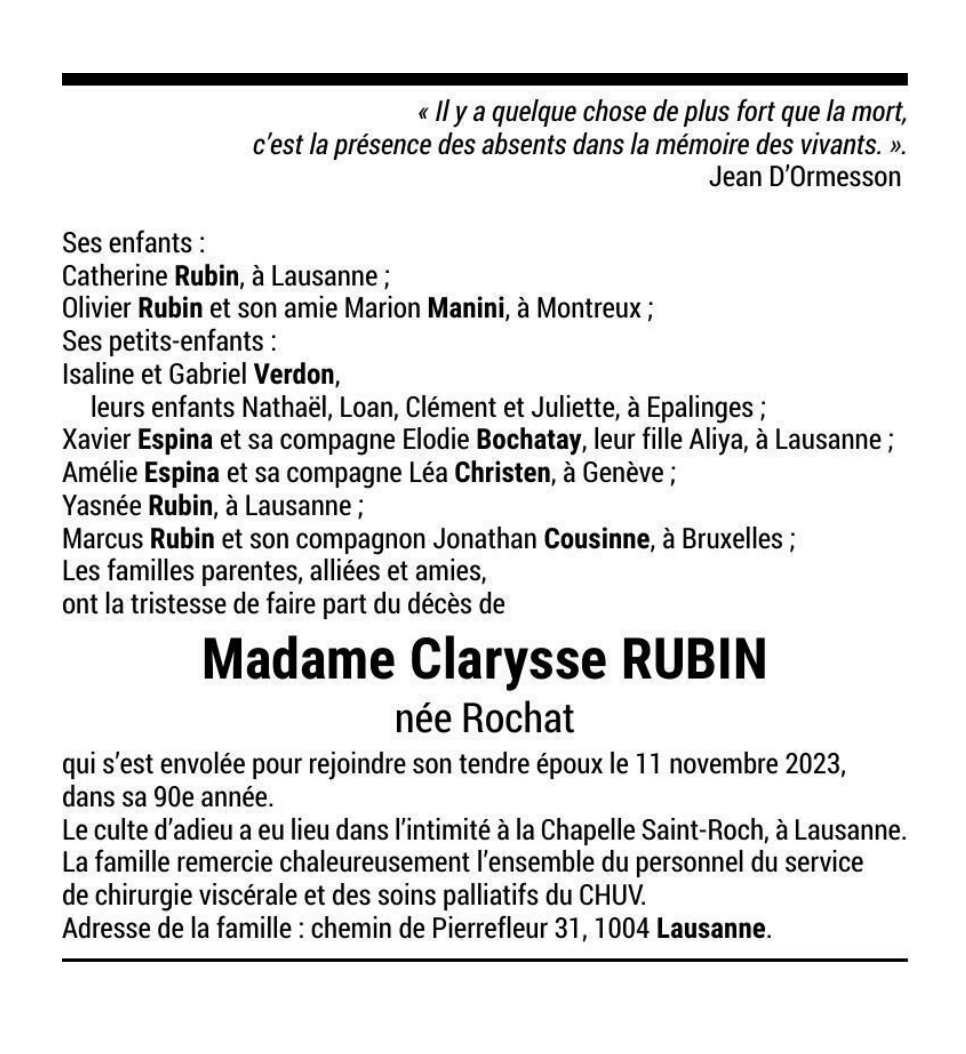 Madame Clarysse RUBIN née Rochat 10 oct. 1934 - 11 nov. 2023 Avis mortuaire PFG Télecharger PDF Partager sur: Galerie PreviousNext PreviousNext