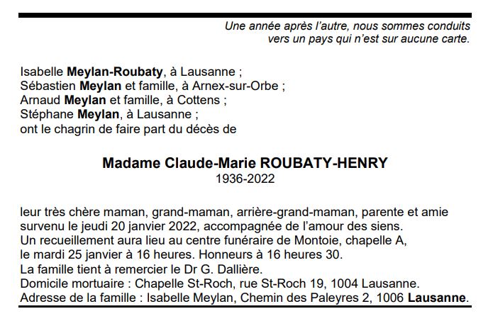 Madame Claude-Marie ROUBATY-HENRY 16 mar. 1936 - 20 jan. 2022 Avis mortuaire PFG Télecharger PDF Partager sur: Galerie PreviousNext PreviousNext