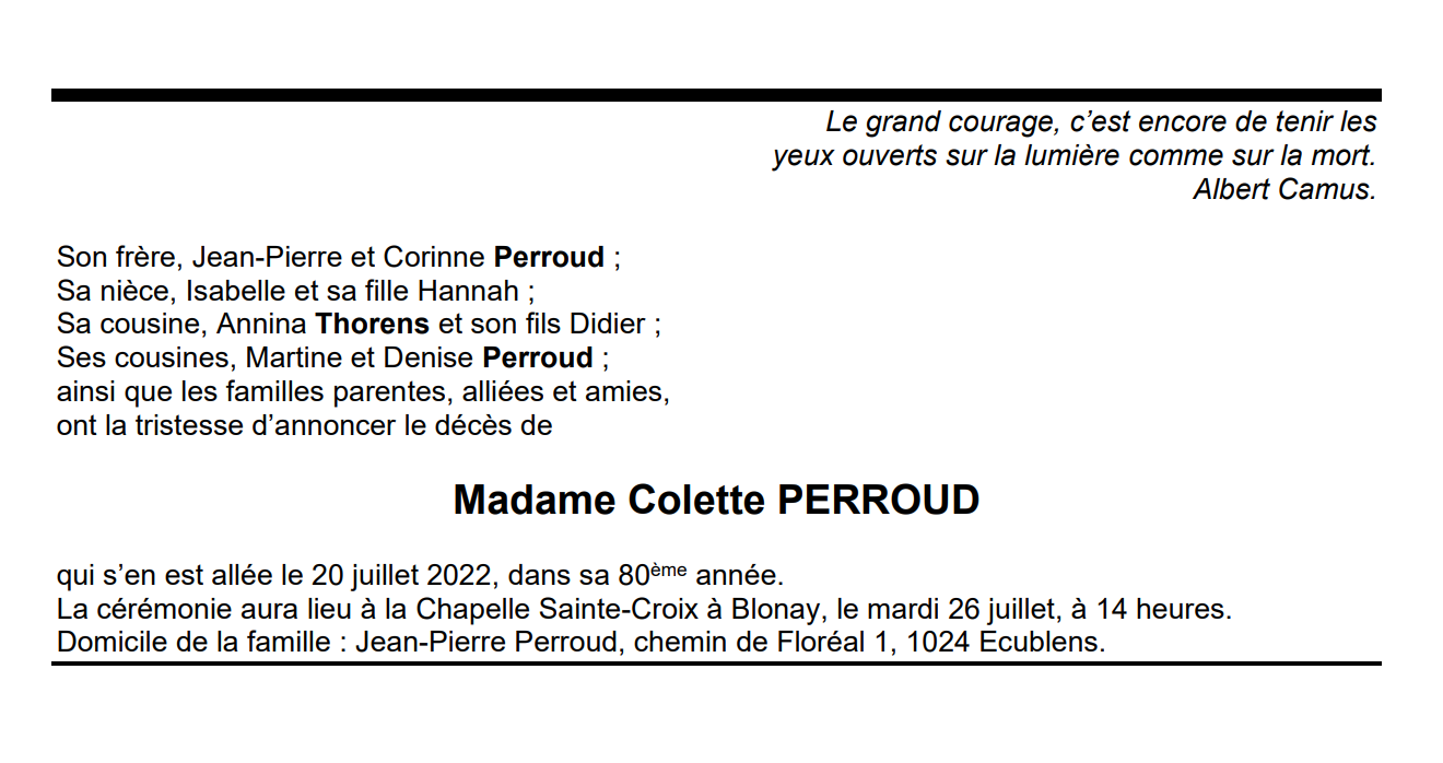 Madame Colette PERROUD 08 sep. 1942 - 20 juil. 2022 Avis mortuaire PFG Télecharger PDF Partager sur: Galerie PreviousNext PreviousNext