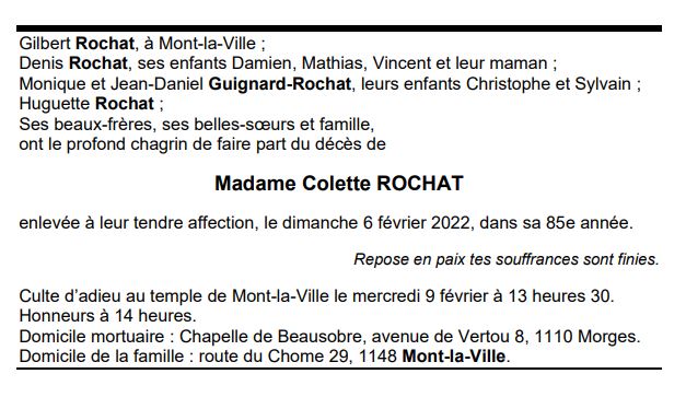 Madame Colette ROCHAT 17 aoû. 1937 - 06 fév. 2022 Avis mortuaire PFG Télecharger PDF Partager sur: Galerie PreviousNext PreviousNext