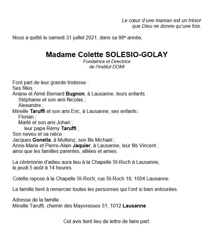Embedded thumbnail for Madame Colette SOLESIO-GOLAY > Galerie > Video or Image