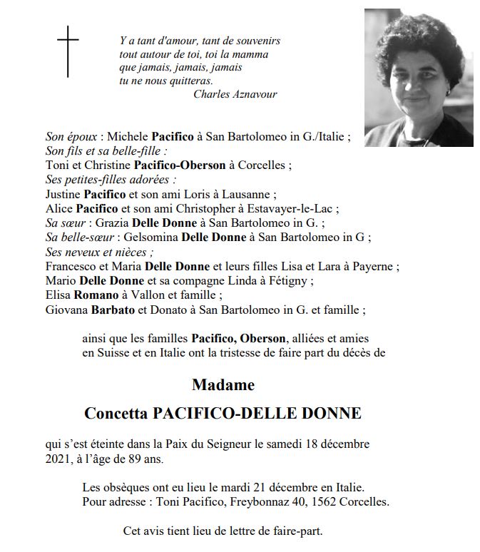 Madame Concetta PACIFICO-DELLE DONNE 19 fév. 1932 - 18 déc. 2021 Avis mortuaire PFG Télecharger PDF Partager sur: Galerie