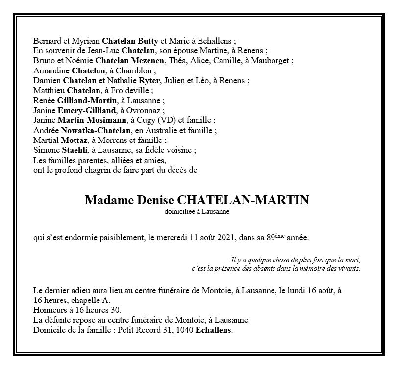 Madame Denise CHATELAN-MARTIN 26 sep. 1932 - 11 aoû. 2021 Avis mortuaire PFG Télecharger PDF Partager sur: Galerie PreviousNext PreviousNext
