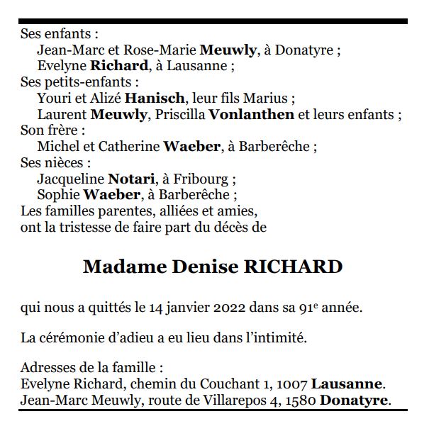 Madame Denise RICHARD 13 juil. 1931 - 14 jan. 2022 Avis mortuaire PFG Télecharger PDF Partager sur: Galerie PreviousNext PreviousNext