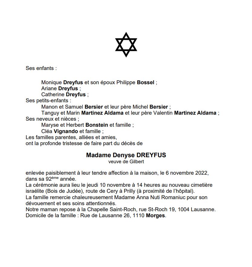 Madame Denyse DREYFUS 31 déc. 1930 - 07 nov. 2022 Avis mortuaire PFG Télecharger PDF Partager sur: Galerie PreviousNext PreviousNext
