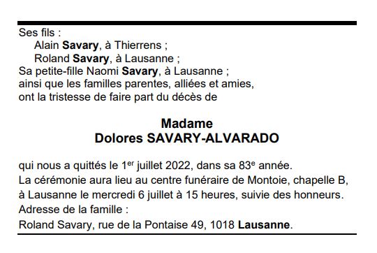 Madame Dolores SAVARY-ALVARADO 17 déc. 1939 - 01 juil. 2022 Avis mortuaire PFG Télecharger PDF Partager sur: Galerie PreviousNext PreviousNext