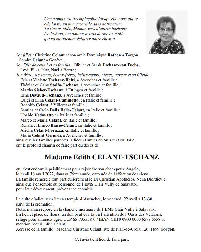 Madame Edith CELANT-TSCHANZ 20 nov. 1946 - 18 avr. 2022 Avis mortuaire PFG Télecharger PDF Partager sur: Galerie PreviousNext PreviousNext