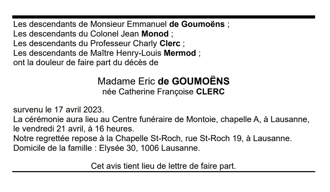 Madame Eric de GOUMOËNS née Catherine Françoise CLERC 01 avr. 1946 - 17 avr. 2023 Avis mortuaire PFG Télecharger PDF Partager sur: Galerie PreviousNext PreviousNext