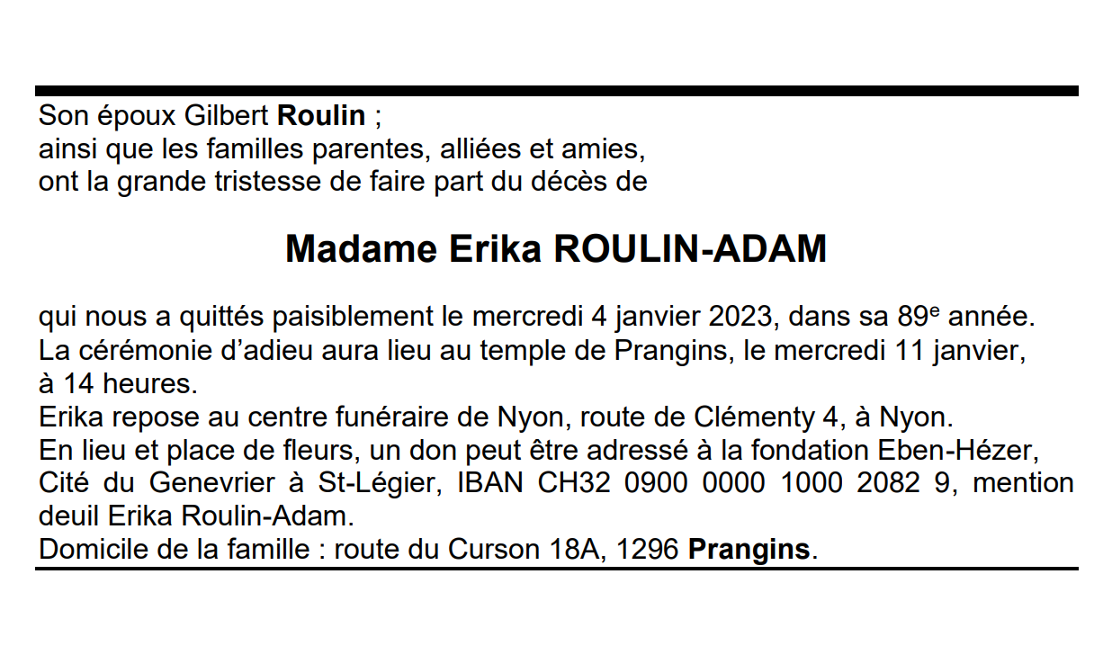 Madame Erika ROULIN-ADAM 23 juin. 1934 - 04 jan. 2023 Avis mortuaire PFG Télecharger PDF Partager sur: Galerie PreviousNext PreviousNext