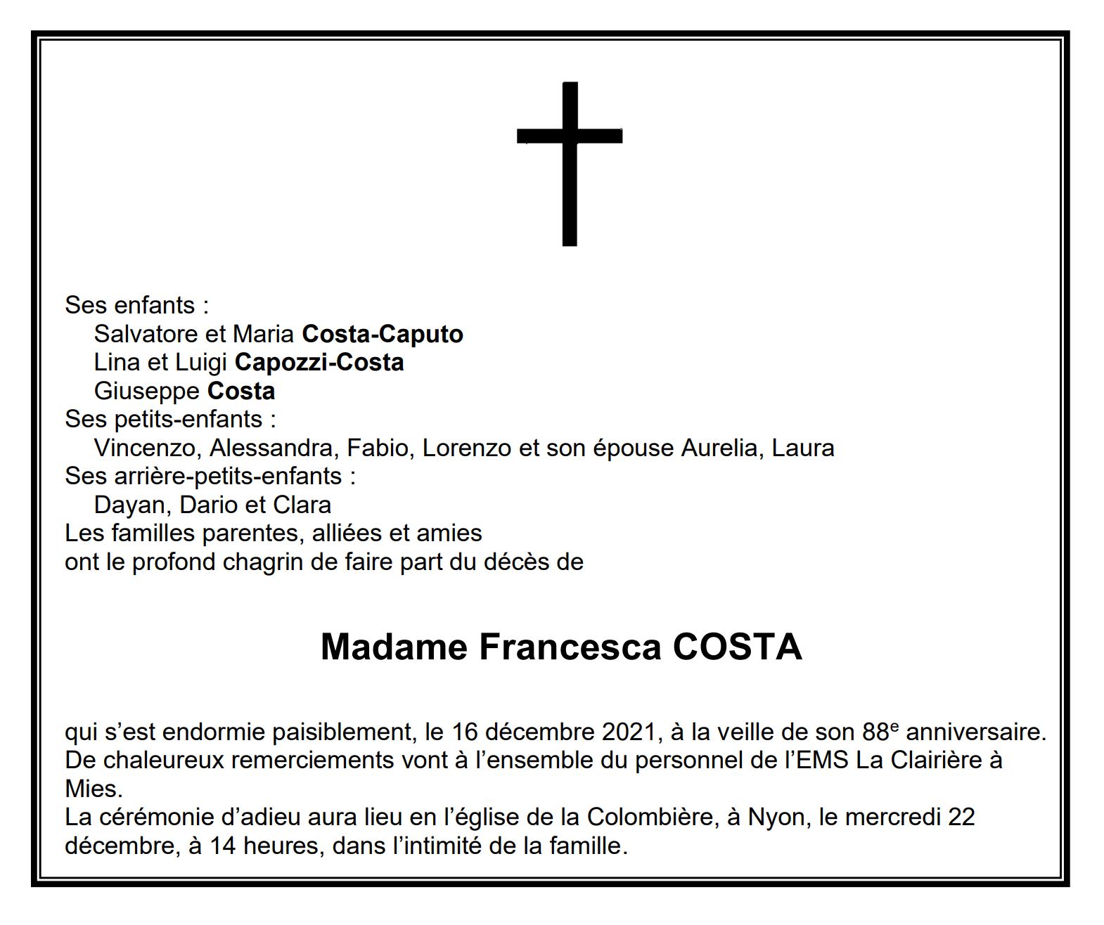 Madame Francesca COSTA 25 déc. 1933 - 16 déc. 2021 Avis mortuaire PFG Télecharger PDF Partager sur: Galerie PreviousNext PreviousNext