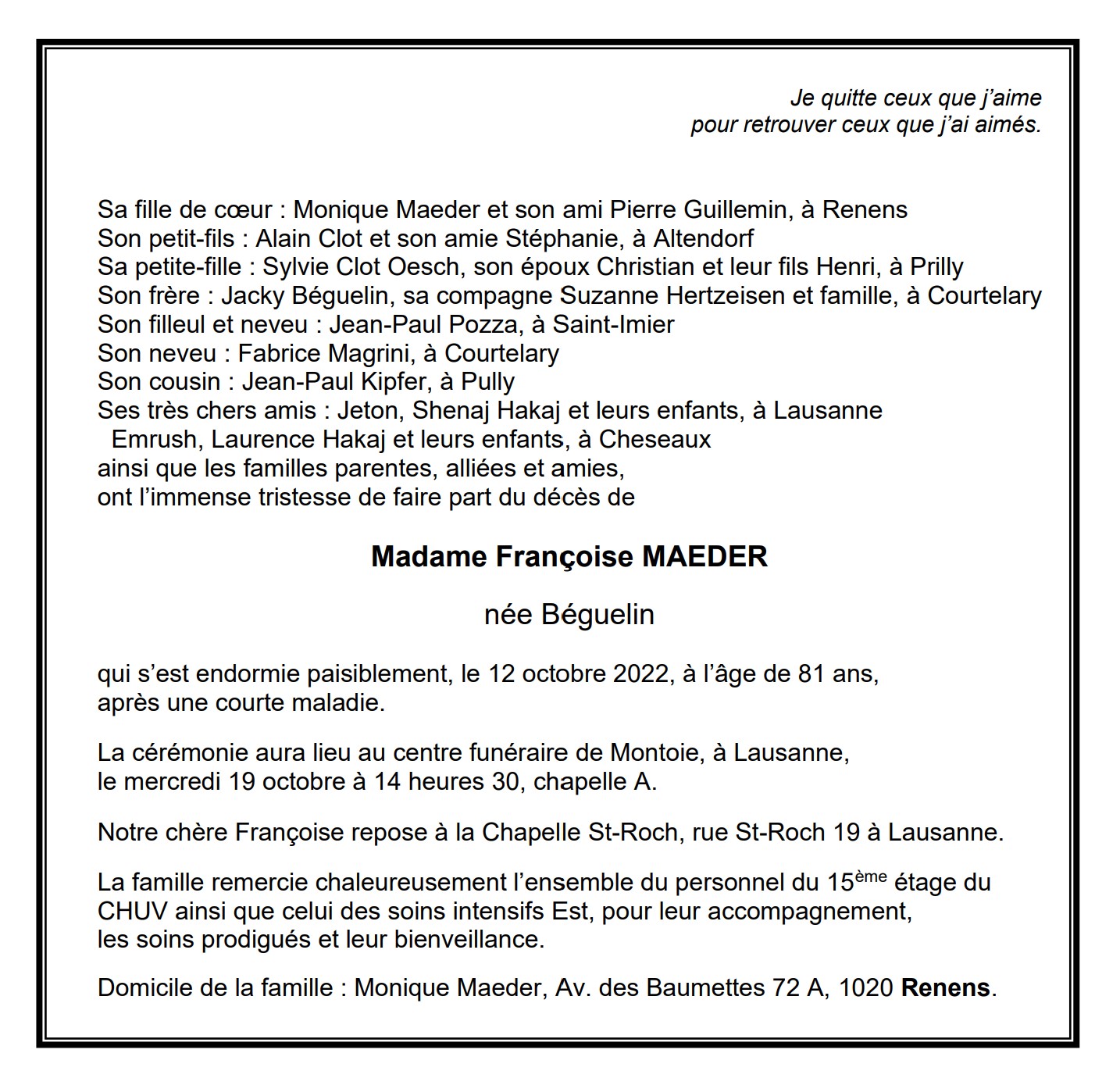 Madame Françoise MAEDER 03 juin. 1941 - 12 oct. 2022 Avis mortuaire PFG Télecharger PDF Partager sur: Galerie PreviousNext PreviousNext