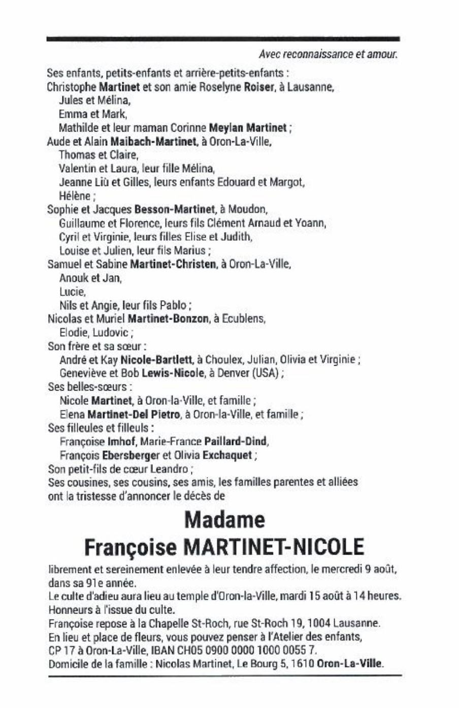 Madame Françoise MARTINET-NICOLE 10 nov. 1932 - 09 aoû. 2023 Avis mortuaire PFG Télecharger PDF Partager sur: Galerie PreviousNext PreviousNext