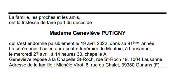 Madame Geneviève PUTIGNY 30 mai. 1931 - 19 avr. 2022 Avis mortuaire PFG Télecharger PDF Partager sur: Galerie PreviousNext PreviousNext