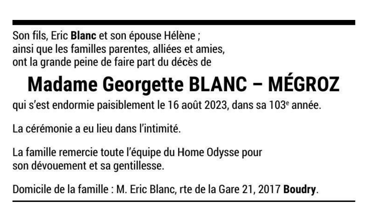 Madame Georgette BLANC-MÉGROZ 15 juin. 1921 - 16 aoû. 2023 Avis mortuaire PFG Télecharger PDF Partager sur: Galerie PreviousNext PreviousNext