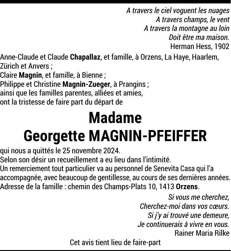 Madame Georgette MAGNIN-PFEIFFER 15 avr. 1925 - 25 nov. 2024 Avis mortuaire PFG Partager sur: Galerie