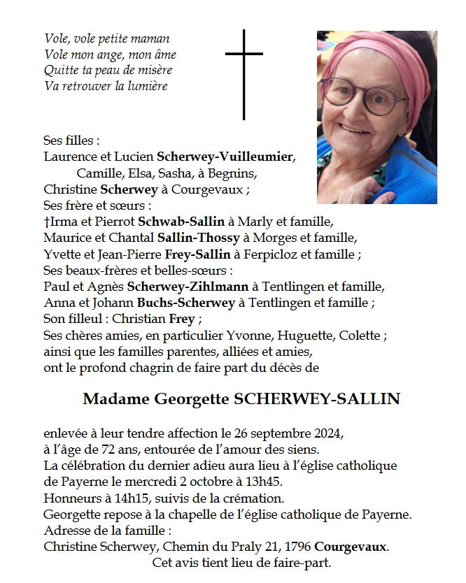 Madame Georgette SCHERWEY-SALLIN 14 mai. 1952 - 26 sep. 2024 Avis mortuaire PFG Télecharger PDF Partager sur: Galerie PreviousNext PreviousNext