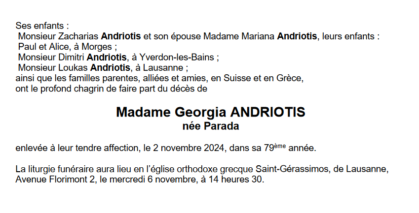 Madame Georgia ANDRIOTIS 28 aoû. 1946 - 02 nov. 2024 Avis mortuaire PFG Télecharger PDF Partager sur: Galerie