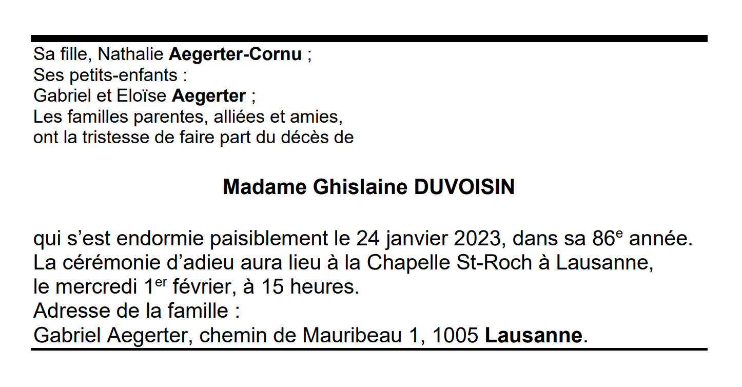 Madame Ghislaine DUVOISIN 02 nov. 1937 - 24 jan. 2023 Avis mortuaire PFG Télecharger PDF Partager sur: Galerie PreviousNext PreviousNext