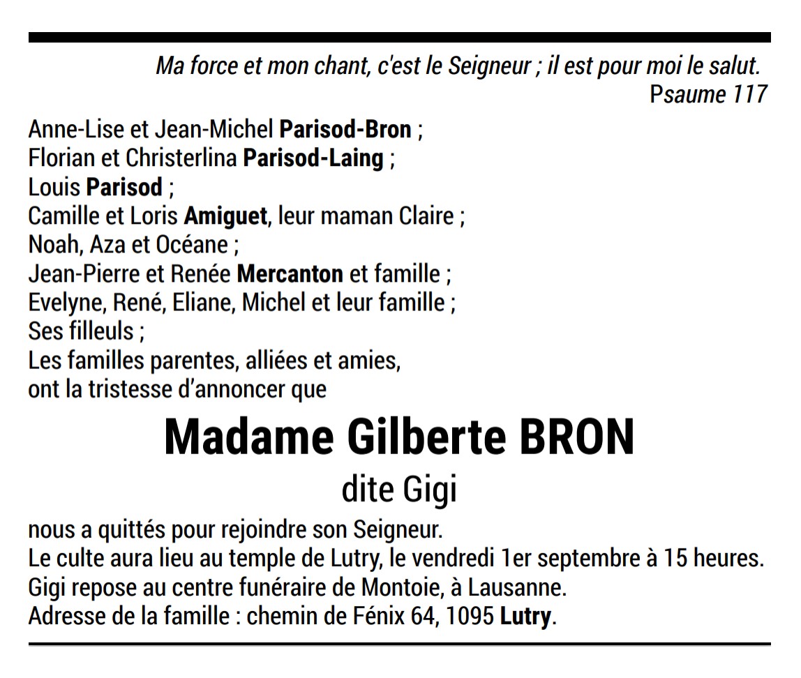 Madame Gilberte BRON dite Gigi Avis mortuaire PFG Télecharger PDF Partager sur: Galerie PreviousNext PreviousNext