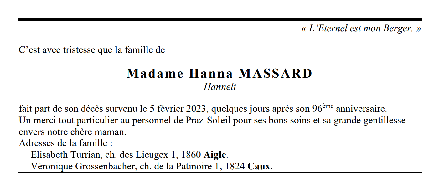 Madame Hanna MASSARD 02 fév. 1927 - 05 fév. 2023 Avis mortuaire PFG Télecharger PDF Partager sur: Galerie PreviousNext PreviousNext