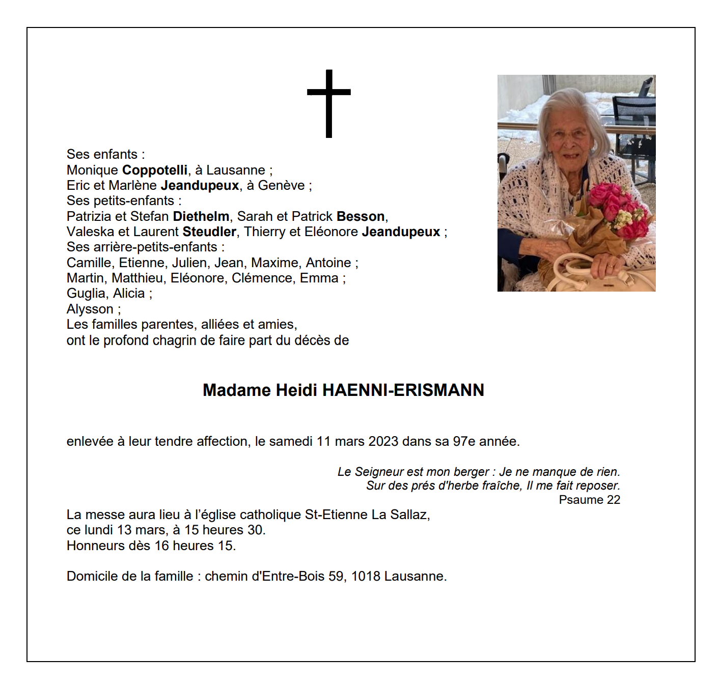 Madame Heidi HAENNI-ERISMANN 27 jan. 1927 - 11 mar. 2023 Avis mortuaire PFG Télecharger PDF Partager sur: Galerie PreviousNext PreviousNext