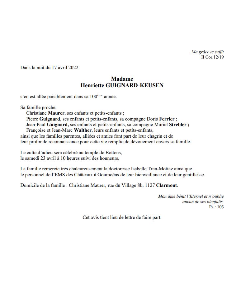 Madame Henriette GUIGNARD-KEUSEN 29 juin. 1922 - 17 avr. 2022 Avis mortuaire PFG Télecharger PDF Partager sur: Galerie PreviousNext PreviousNext