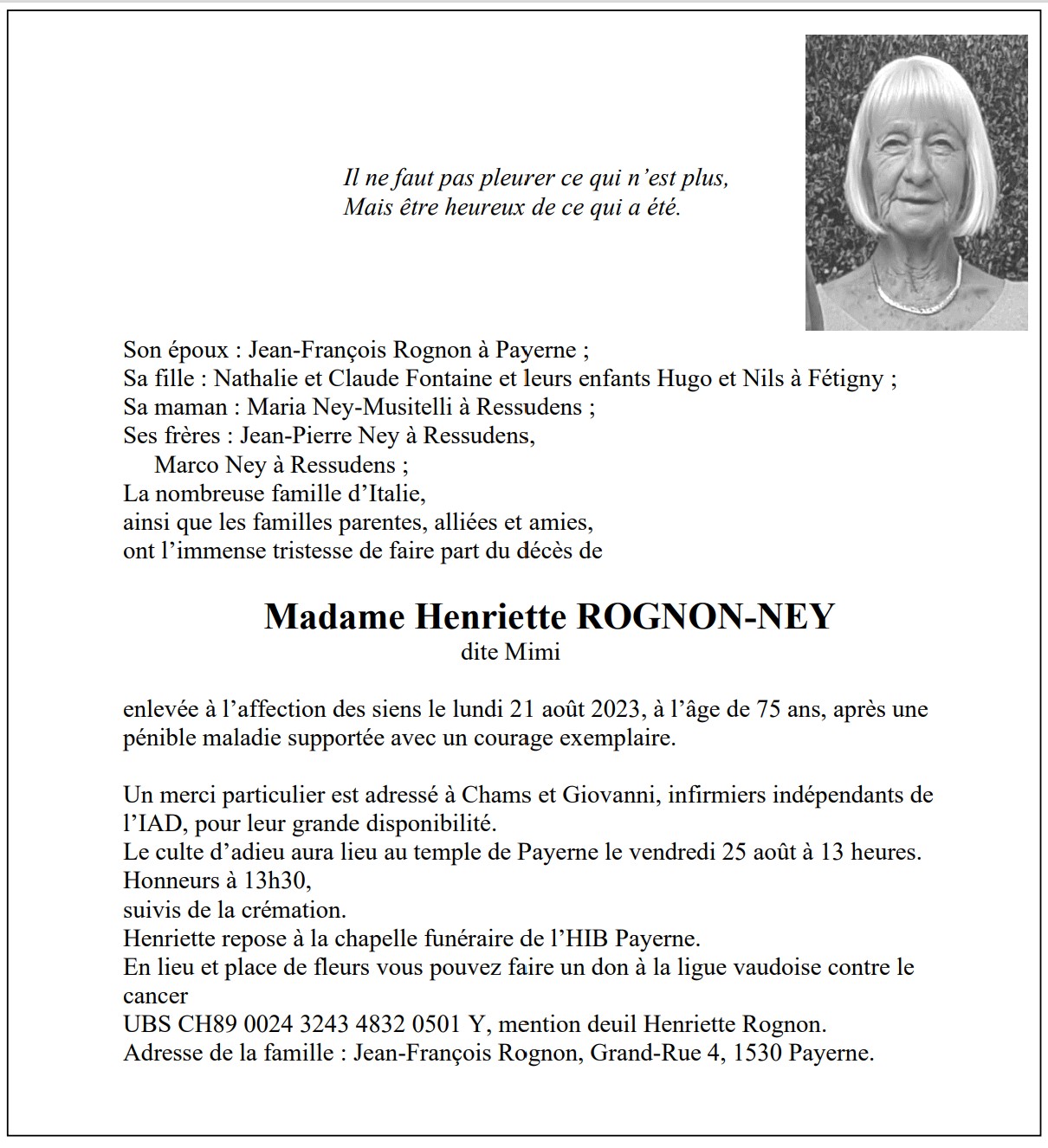 Madame Henriette ROGNON-NEY dite Mimi 11 juil. 1948 - 21 aoû. 2023 Avis mortuaire PFG Télecharger PDF Partager sur: Galerie PreviousNext PreviousNext
