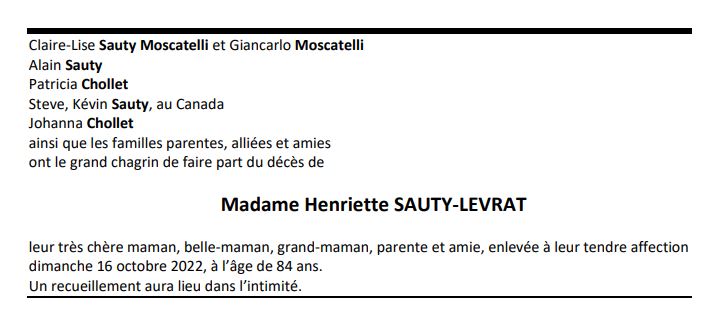 Madame Henriette SAUTY-LEVRAT