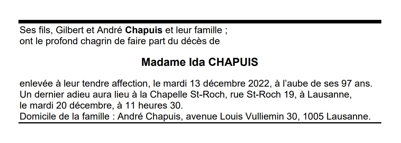 Madame Ida CHAPUIS 14 jan. 1926 - 13 déc. 2022 Avis mortuaire PFG Télecharger PDF Partager sur: Galerie PreviousNext PreviousNext