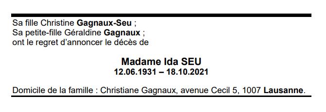 Madame Ida SEU 12 juin. 1931 - 18 oct. 2021 Avis mortuaire PFG Télecharger PDF Partager sur: Galerie PreviousNext PreviousNext
