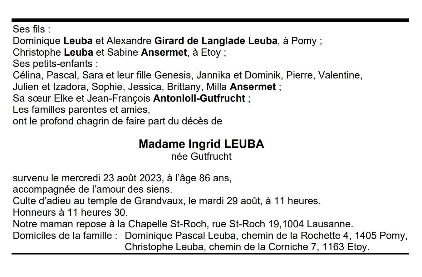 Madame Ingrid LEUBA née Gutfrucht 21 juil. 1937 - 23 aoû. 2023 Avis mortuaire PFG Télecharger PDF Partager sur: Galerie PreviousNext PreviousNext