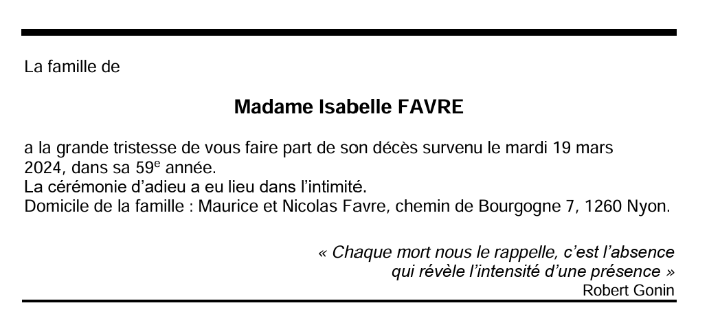 Madame Isabelle FAVRE 16 mai. 1965 - 19 mar. 2024 Avis mortuaire PFG Télecharger PDF Partager sur: Galerie PreviousNext PreviousNext