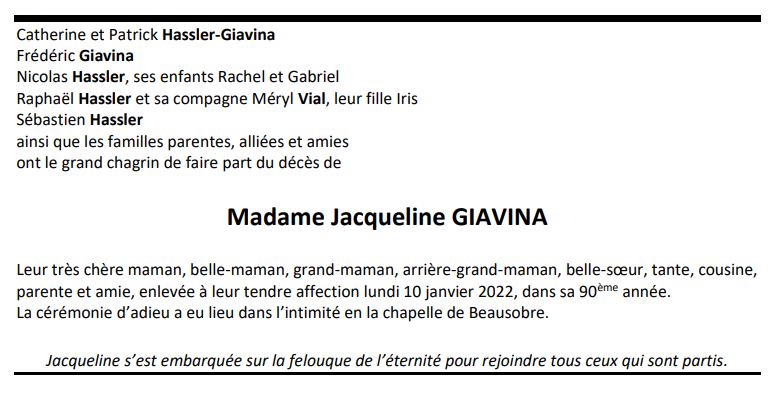 Madame Jacqueline GIAVINA 02 juin. 1932 - 12 jan. 2022 Avis mortuaire PFG Télecharger PDF Partager sur: Galerie PreviousNext PreviousNext