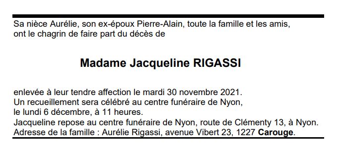 Madame Jacqueline RIGASSI 09 oct. 1952 - 30 nov. 2021 Avis mortuaire PFG Télecharger PDF Partager sur: Galerie PreviousNext PreviousNext