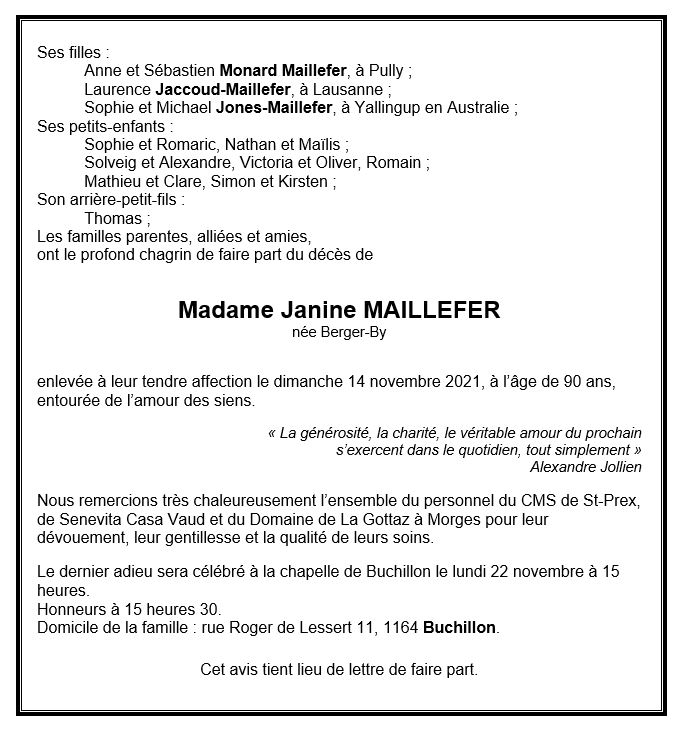 Madame Janine MAILLEFER 03 aoû. 1931 - 14 nov. 2021 Avis mortuaire PFG Télecharger PDF Partager sur: Galerie PreviousNext PreviousNext