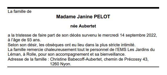 Madame Janine PELOT 26 mai. 1929 - 14 sep. 2022 Avis mortuaire PFG Télecharger PDF Partager sur: Galerie