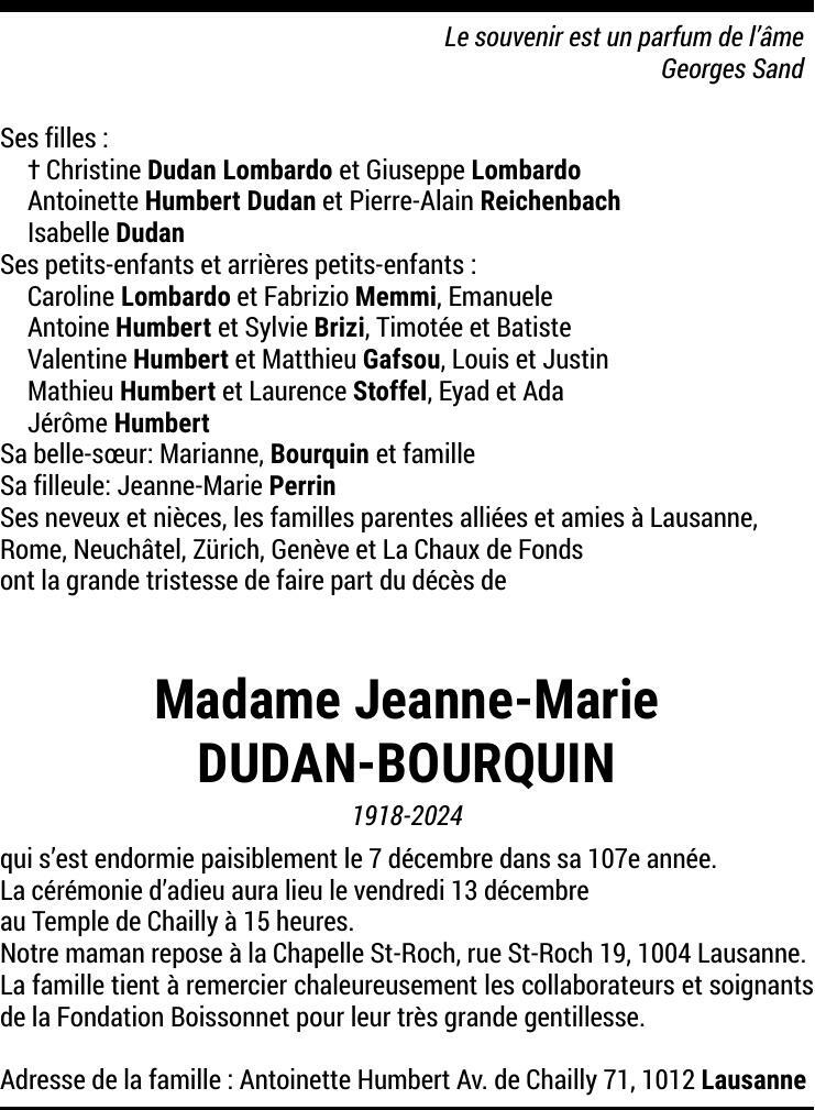 Madame Jeanne-Marie DUDAN-BOURQUIN 10 aoû. 1918 - 07 déc. 2024 Avis mortuaire PFG Partager sur: Galerie PreviousNext PreviousNext