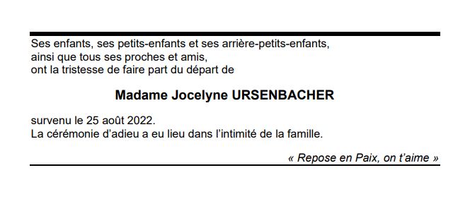 Madame Jocelyne URSENBACHER 26 jan. 1943 - 25 aoû. 2022 Avis mortuaire PFG Télecharger PDF Partager sur: Galerie PreviousNext PreviousNext